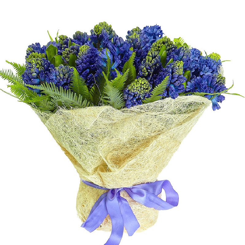 Букет состоит из 35 синих гиацинтов, красивая упаковка, атласная лента.