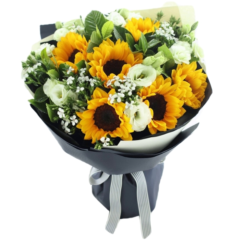 Букет состоит из 7 подсолнухов, 6 веток эустомы, декоративная зелень, красивая упаковка, атласная лента.