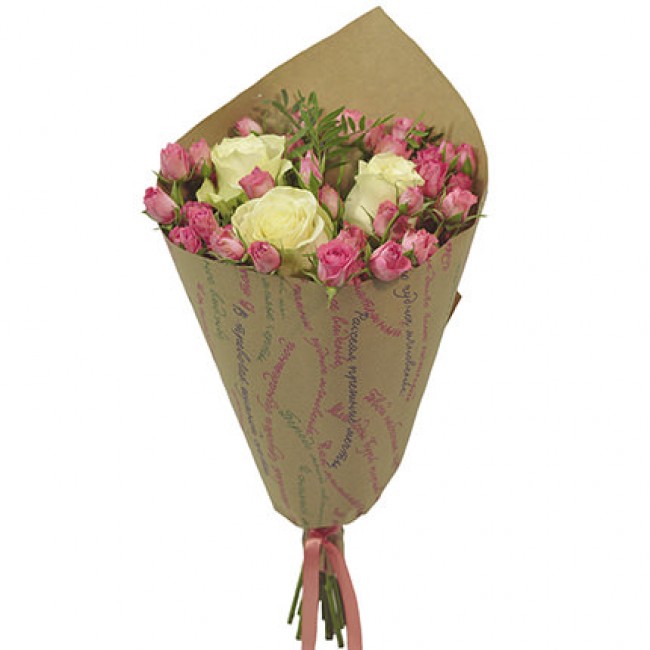 Букет состоит из 3 белые розы, 4 ветки кустовой розовой розы, крафт, розовая лента.