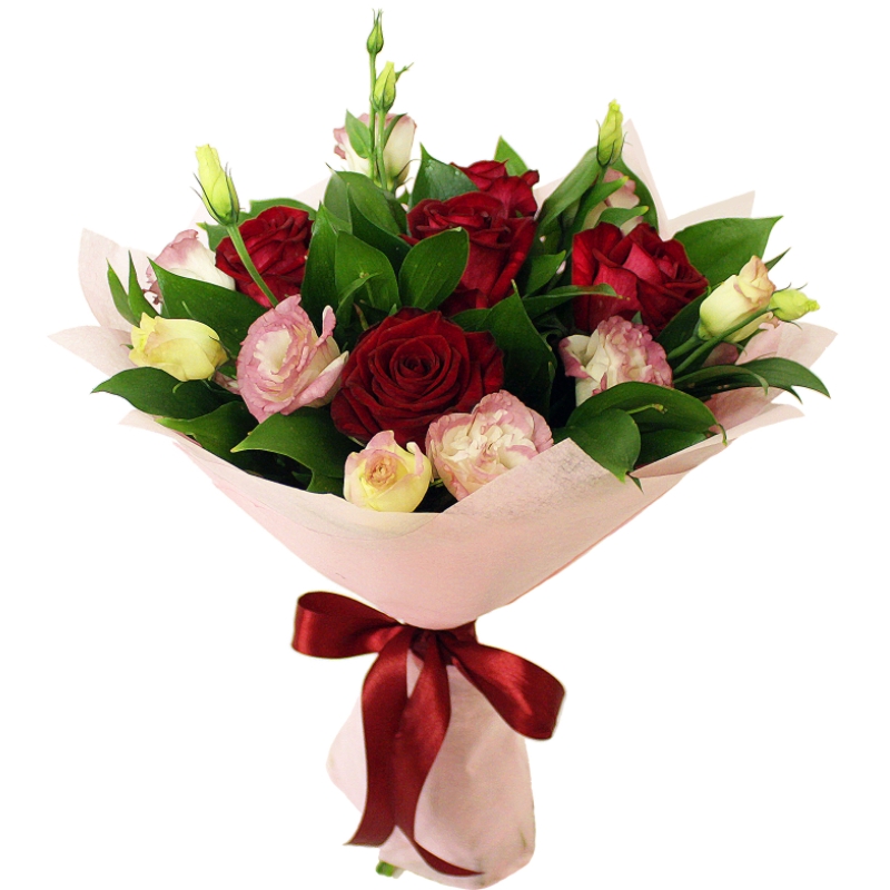 Букет состоит из 5 красных роз, 3 ветки эустомы, зелень, красивая упаковка, атласная лента.