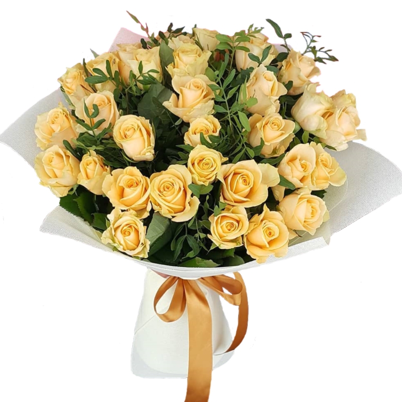 Букет состоит из 31 кремовая роза, зелень, красивая упаковка, атласная лента.